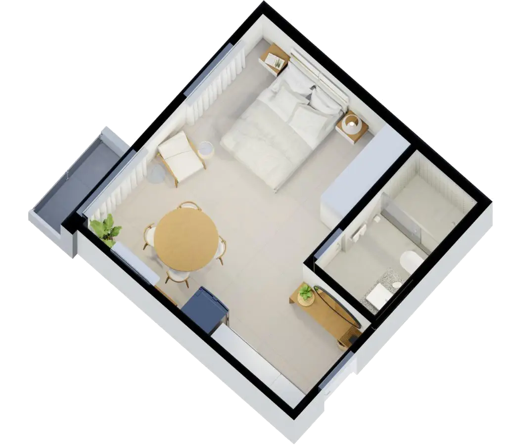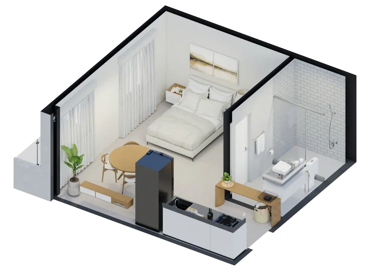 Más que un espacio, una experiencia. Nuestros monoambientes han sido concebidos bajo el concepto de un espacio integrado donde la sala de estar, el área de comedor y la cocina convergen en un ambiente fluido y armónico. Un diseño inteligente que maximiza cada metro cuadrado, brindando sensación de amplitud, luz natural y la flexibilidad para adaptar el entorno a cada momento de tu día. La conectividad se siente en cada rincón, permitiéndote personalizar el ambiente con facilidad, reflejando el espíritu Smart de Plaza Suites 1.